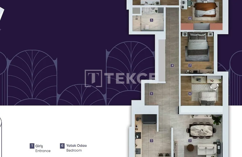 The residences are equipped with high-end features such as built-in kitchen appliances, dishwasher, microwave, refrigerator, guillotine glass balconies, internet and satellite TV infrastructure, air conditioning, smart home system, fingerprint entry system, underfloor heating, combi boiler, and a cloakroom. In addition, the apartments are designed with heat and sound insulation to ensure energy efficiency and year-round comfort.
